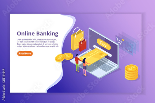 Online charity donation vector website template, web page and landing page design for website and mobile site development. Online services for charity concept with isometric donation box, dollar coins