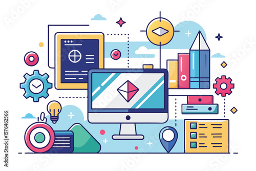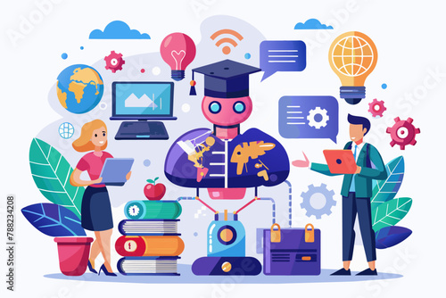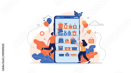 Vector illustration of big mobile phone and characters texting messages using laptop, tablet. Online communication, virtual relationships and social networking concepts for web banner, website page.