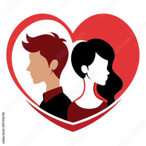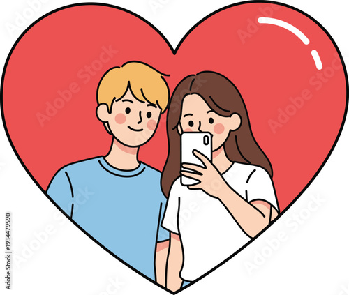 Two red hearts with boy and girl chatting, getting acquaintance using mobile phones, vector illustration in paper art style. Online dating app concept.