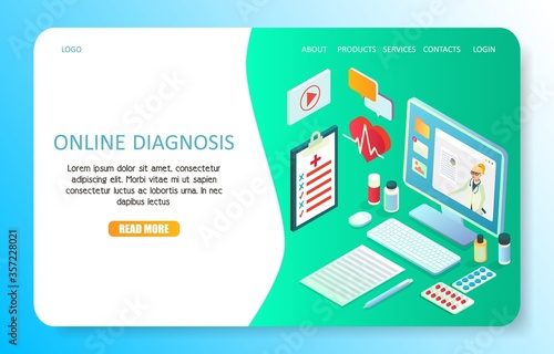 Online diagnosis landing page website template. Vector isometric illustration. Online doctor medical consultation and support concept.