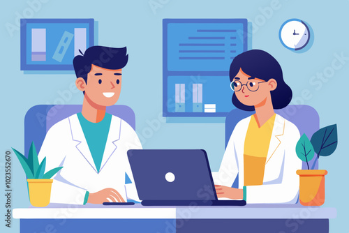 Online doctor helping patient female from computer screen, flat vector illustration. Remote medical consultation, telemedicine.