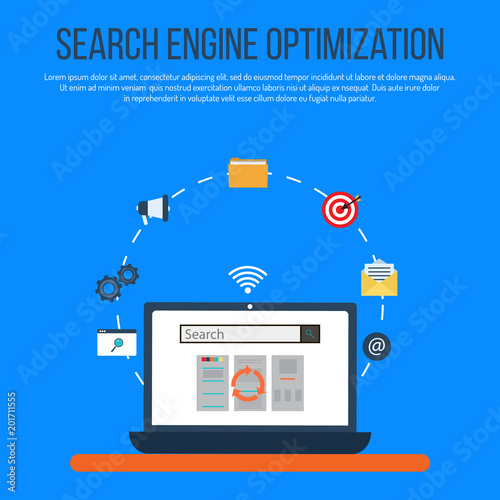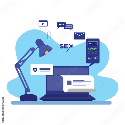 Online education concept. Vector illustration in flat style. Internet training courses design elements. Laptop on a table.