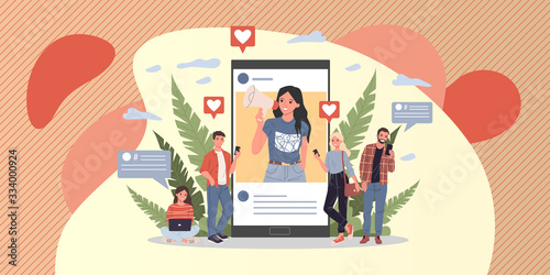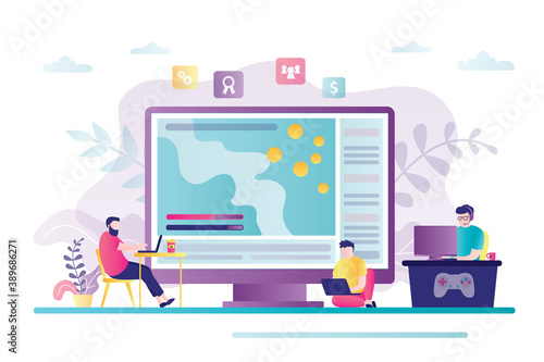Online fake news concept flat vector illustration. Tiny people and huge laptop computer with cracked planet Earth globe, journalist with mic on screen. Online news media, disinformation, propaganda.