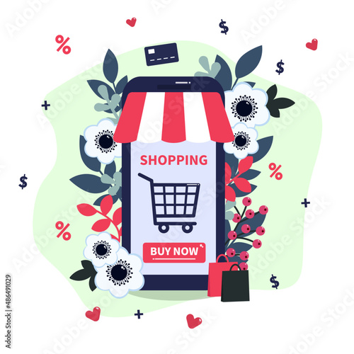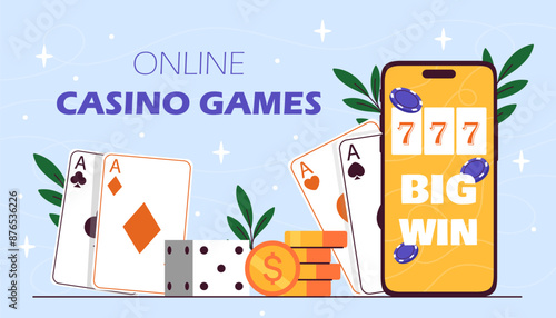 Online gambling vector poster banner design template. Smartphone, roulette wheel, playing cards, slot game, poker chips, dice, dollar coins, trophy cup. Poker mobile app, online mobile casino games.