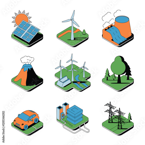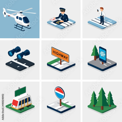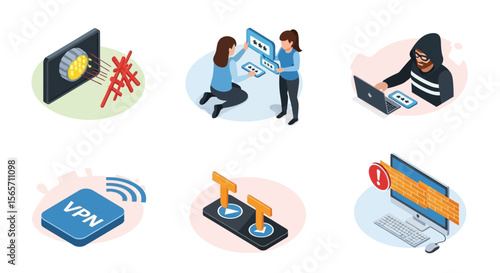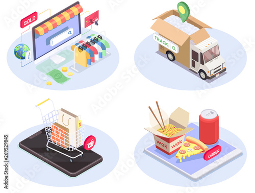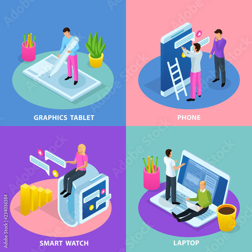 Online medical services vector flat isometric poster set. Online clinical consult, Heart rate monitor, Medication reminder, Emergency alert concept design elements for web banners, print, infographics