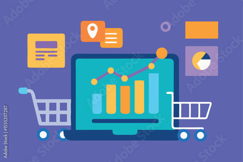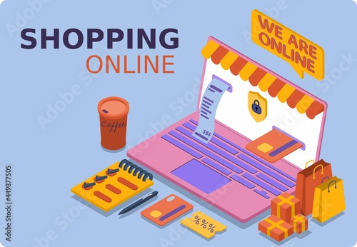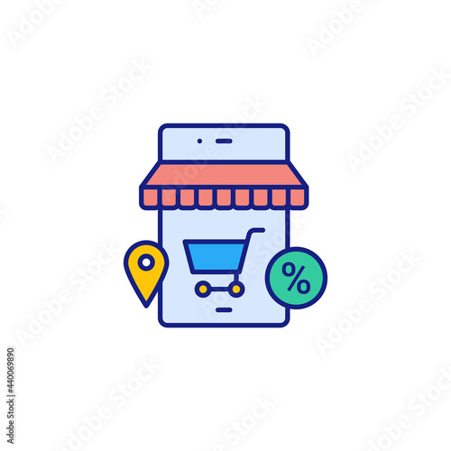 Online mobile shopping concept. Vector illustration in flat style design. Smartphone with purchase icons, bank card, shopping cart, delivery service. Payment on internet.