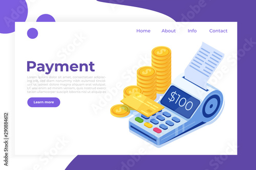 Online payment services landing page website template. Vector isometric illustration of smartphone with dollar coins and paper receipt. Internet payments, online bank concept.