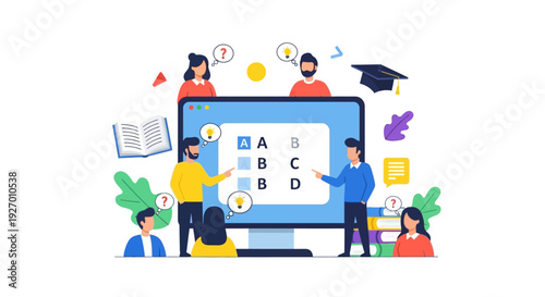 Online poker concept vector illustration. Computer with virtual poker table on monitor screen, gambling chips, cards, dollar coins, purse with paper money, glasses. Internet casino poker poster banner