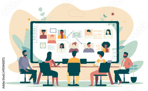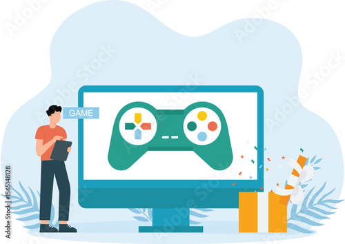 Online poker, vector flat style design illustration. Internet poker casino gambling concept with tiny characters players and big computer monitor with playing cards on screen.