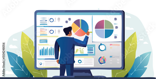 Online poker, vector flat style design illustration. Internet gambling, online casino room concept with tiny characters players, big computer monitor and laptop with playing cards on screens.