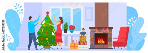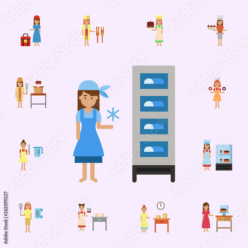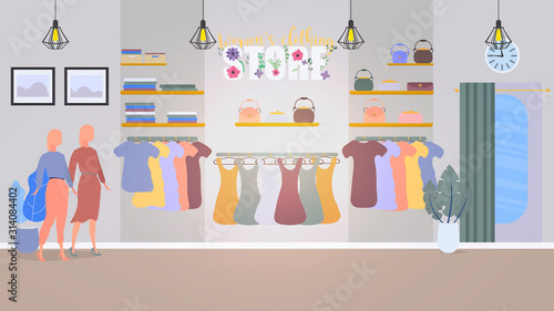 Online sewing masterclass, vector flat illustration. Seamstress or tailor sewing blue dress in front of laptop computer. Sewing video tutorial, course, distance learning, video conferencing technology