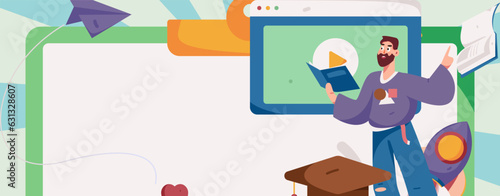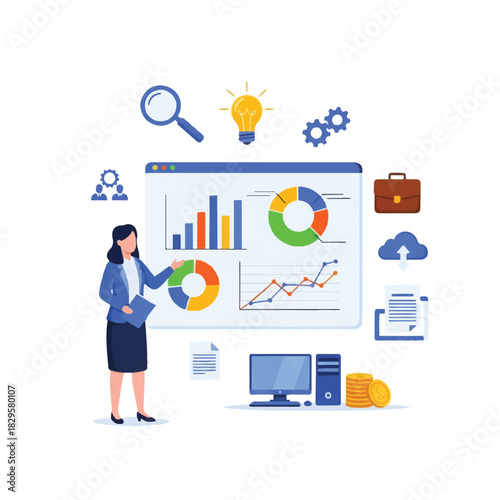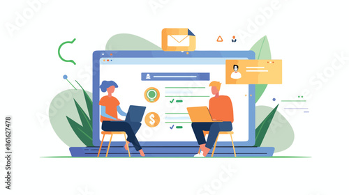 Vector illustration of big computer and tiny people making purchases of bags, shoes in internet shop. Online shopping, e-commerce concept for web banner, website page etc.