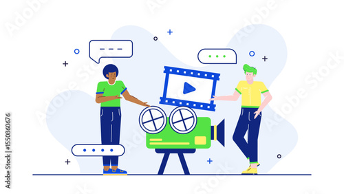 Online shop, vector flat illustration. Big smartphone with bank card and delivery man with cardboard box on screen, tiny women with shopping cart, bags. Online store app, internet payment, delivery.
