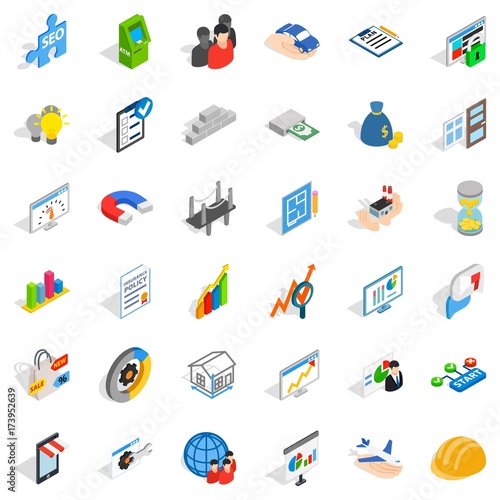 Online shopping and delivery service, isometric icon set, flat vector isolated illustration. Internet store. New arrivals of clothes. Courier delivering parcel from shop to customer home door.