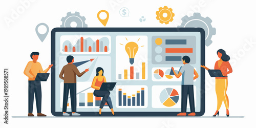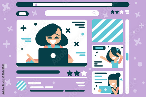 E-commerce and online shopping, vector illustration. Huge laptop and micro male and female characters buying clothes on the internet. Online payment, delivery services composition for website page etc