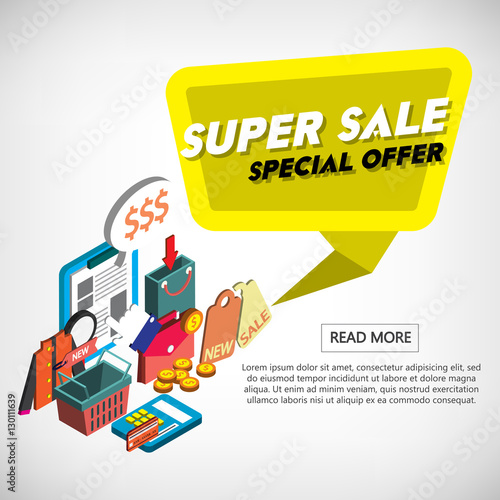 Online shopping landing page template for website and mobile site development. Vector isometric mobile phone, woman with shopping cart full of purchases, credit card. Internet store web page concept.