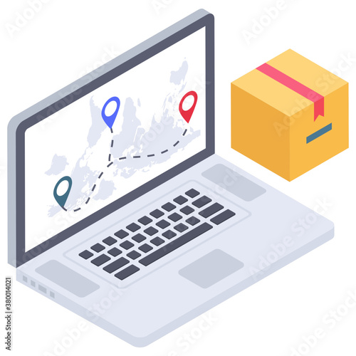 Online slot machine on laptop vector. Jackpot fruit gambling 777 computer game. Isometric design isolated on white background