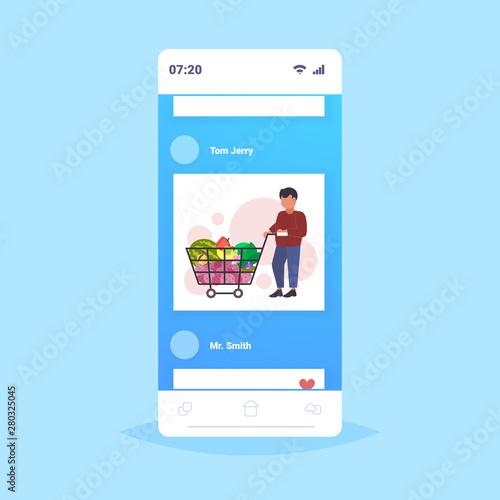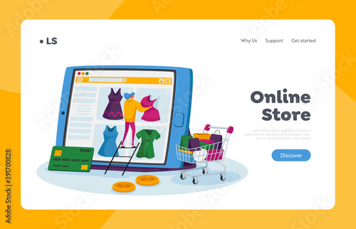Internet store application on mobile phone screen, wallet, credit card, vector flat illustration. E-commerce, internet shopping, mobile payments.