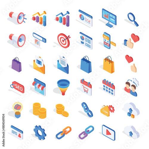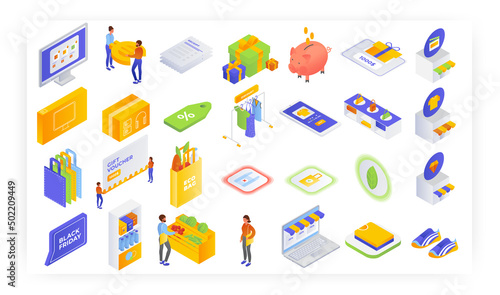 Internet store isometric icon set, flat vector isolated illustration. Sales and discounts, Black friday, electronic payment, ecommerce, gift voucher, loyalty program. Online shopping.