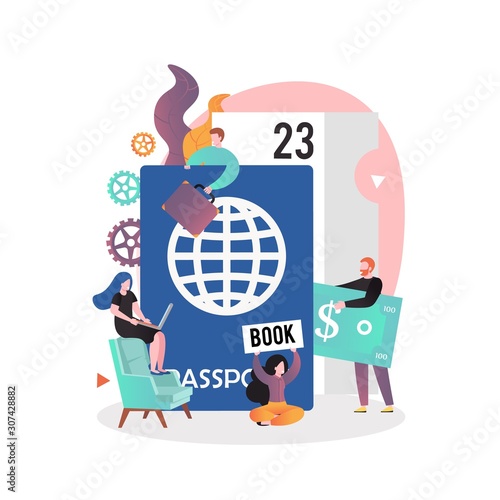 Online tour booking concept vector illustration. Travel agency search and flight booking composition with micro male and female characters and huge passport for web banner, website page etc.
