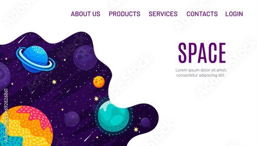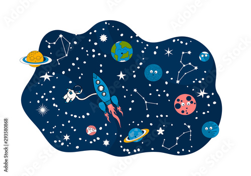 Open book with starry sky, solar system planets orbiting Sun, zodiac constellations, vector illustration in paper art style. Astrology, astronomy science, imagination, horoscope predictions.