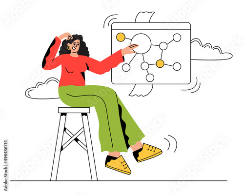 Huge human brain with keyhole, micro characters business people holding big key, looking through telescope, vector flat style design illustration. Open mind with key concept.