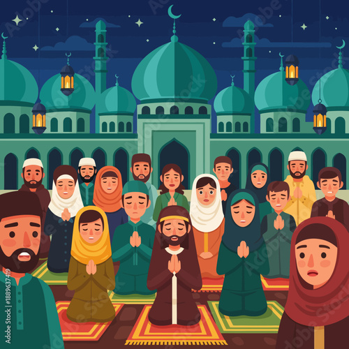 Opera theater scene with red curtains. Symphony orchestra performing on stage, vector illustration. Conductor and musicians playing violin, double bass, flute, tuba. Classical music concert.