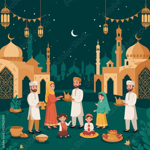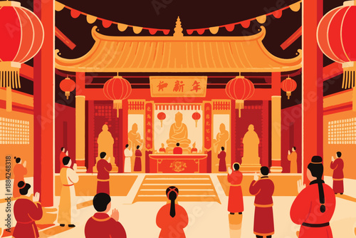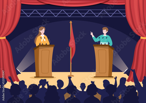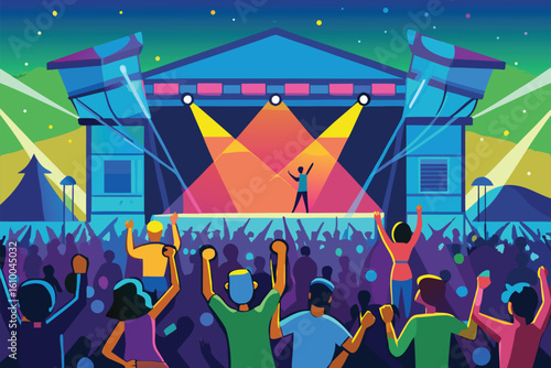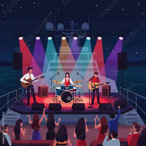 Opera theater scene with red curtains. Symphony orchestra performing on stage, vector illustration. Conductor and musicians playing violin, double bass, flute, tuba. Classical music concert.