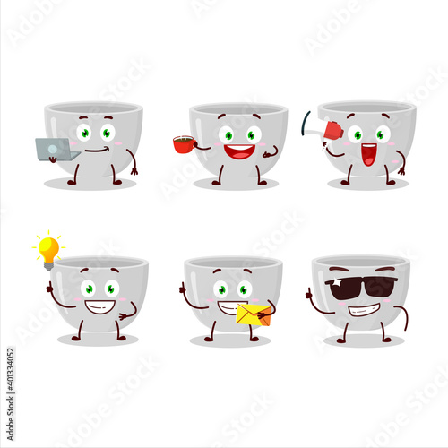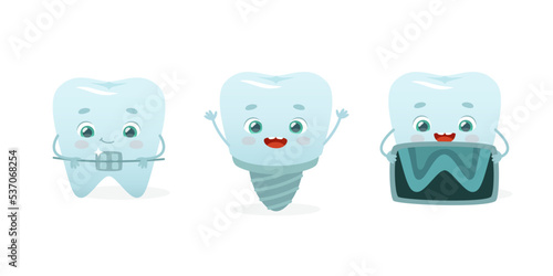 Oral care dental floss vector poster, banner template. Smiling healthy white teeth cartoon characters with string dental floss in container. Children dentistry, oral health, teeth cleaning and hygiene