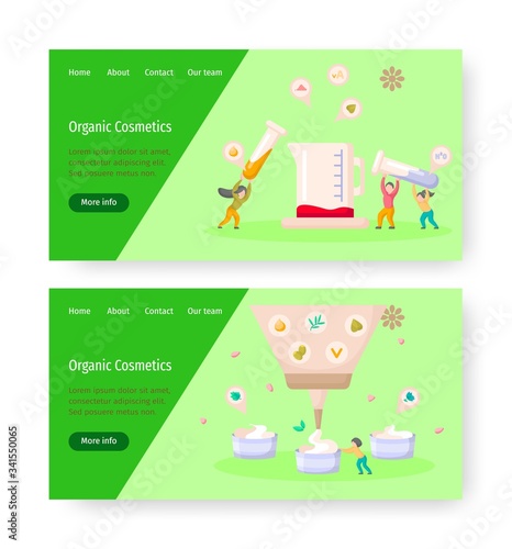Organic cosmetic concept illustration. People mix ingredients in a lab to make skincare cream. Natural healthy skin cosmetics. Vector web site design template. Landing page website illustration