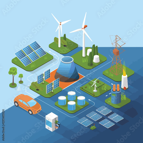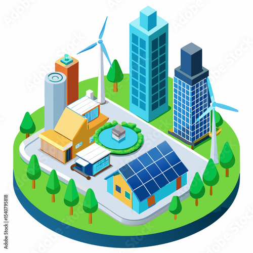 Organic farming. Greenhouse, wind turbines and solar panels, flat vector isometric illustration. Glasshouse using clean energy from sun and wind. Green alternative energy. Eco farm.