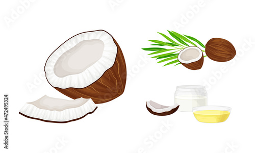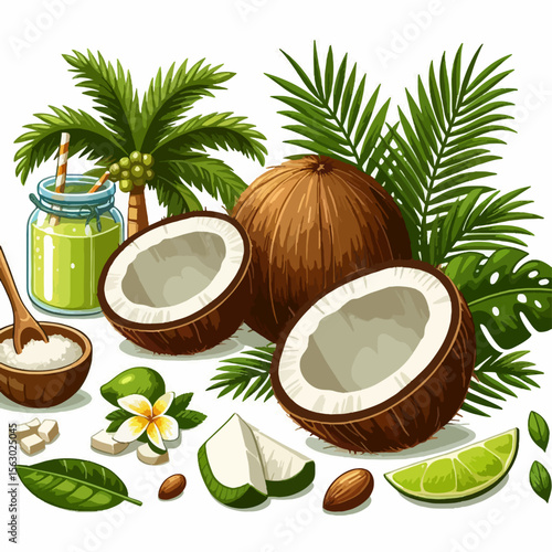 Coconut water vector illustration. Realistic composition of organic drink in aluminium can, cocos, palm leaves for poster, banner, etc. Refreshing coconut juice packaging.