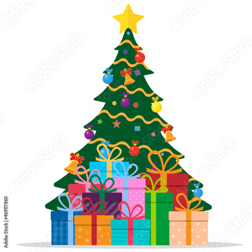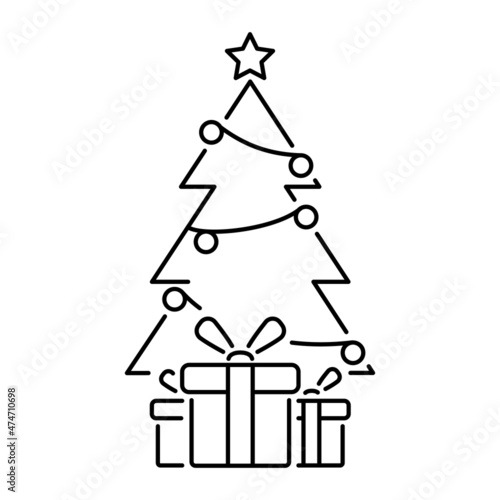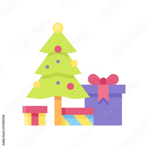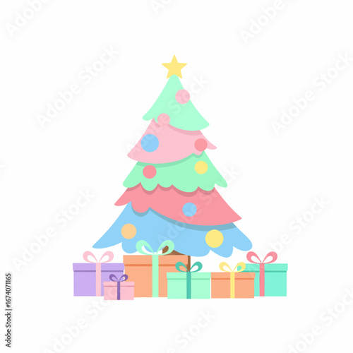 Origami Christmas tree with gift box and lantern vector design. Xmas present and greeting to happy new year illustration. Festive card, poster or banner template