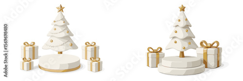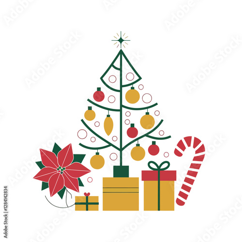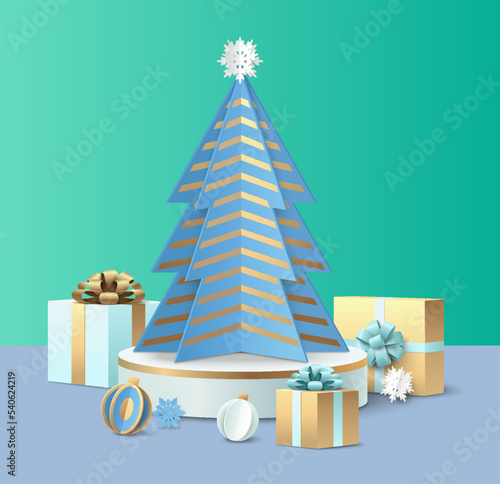 Christmas tree with star and gift vector. Origami fir decorated to Merry Xmas and Happy New Year. Decoration bauble ball, present box with surprise illustration for greeting card in paper cut style