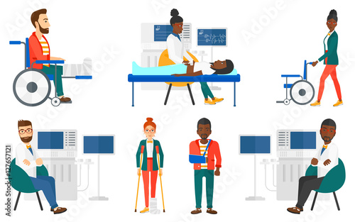 Osteopath examining xray pictures of patient joints, spine bones, flat vector illustration. Shoulder, elbow, knee, foot arthritis, spinal disease. Osteoarthritis, osteoporosis, osteopathy chiropractic