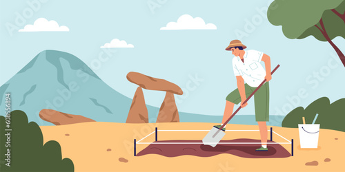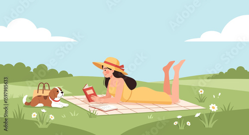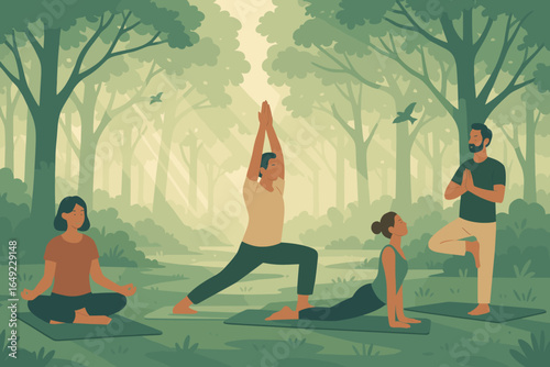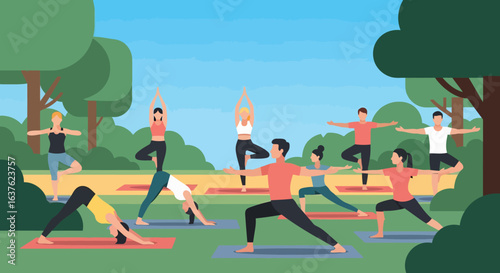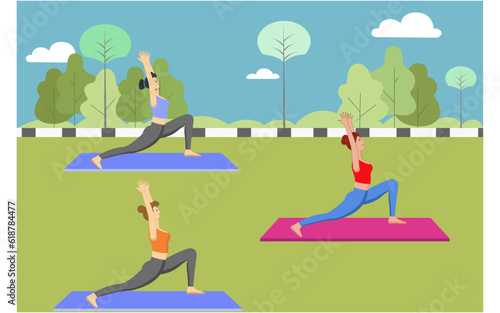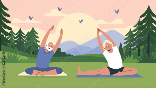 Outdoor yoga class in nature mountain landscape. Yoga exercise concept vector illustration. Man and woman training together, cartoon characters. Healthy lifestyle, sport activity.