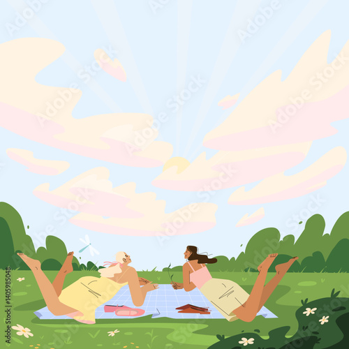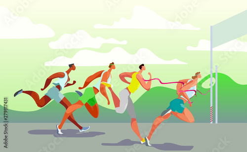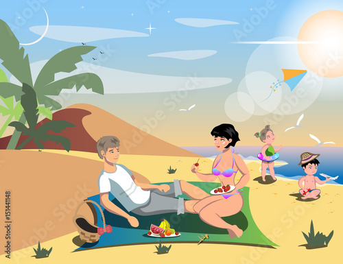 Outdoor yoga concept vector illustration. Happy family training together on a beach. Healthy lifestyle, active recreation. Morning meditation with beutiful sea landscape.