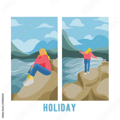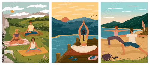Outdoor yoga concept vector illustration. Woman and man training together on a beach. Healthy lifestyle, recreation. People meditate in lotus yoga pose. Morning meditation in beutiful landscape