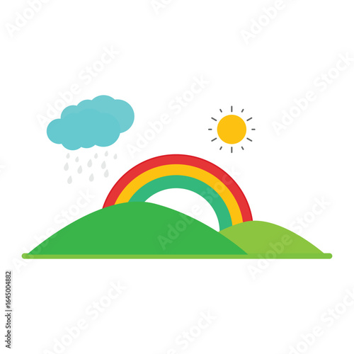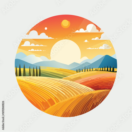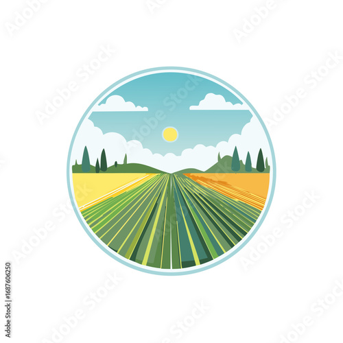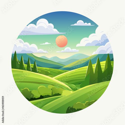 Panorama view on green field over cityscape skyline with residential apartment houses vector illustration in paper cut craft style. Summer or spring landscape nature scene background