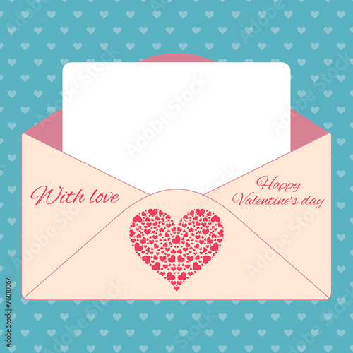 Paper cut craft style Valentines Day love letter. Open envelope with love message, pink flowers, hearts, bird, vector illustration. Greeting card, invitation template.