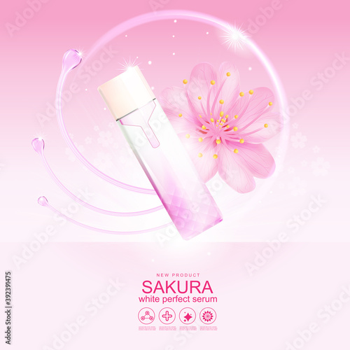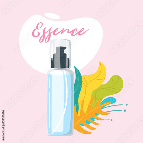 Paper cut flower with realistic plastic cosmetic pump bottle, vector illustration. Body lotion, soap. Beauty and skin care cosmetic product branding mockup, advertising.