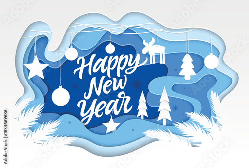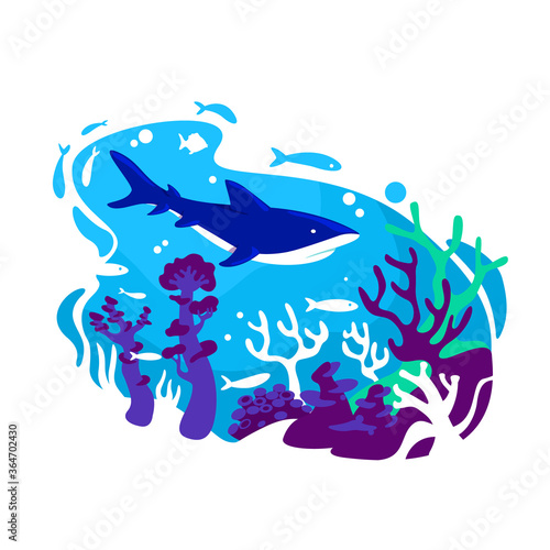 Paper cut craft style underwater sea cave with fishes and diver silhouette swimming with diving flashlight, vector illustration. Underwater world landscape. Scuba diving poster banner design template.