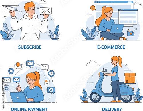 Parent child relationship set, vector flat illustration. Happy mother combing her daughters hair, father teaching his son to ride bicycle. Parenting, parent love and care for kids.