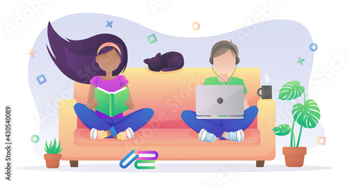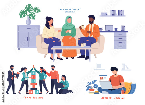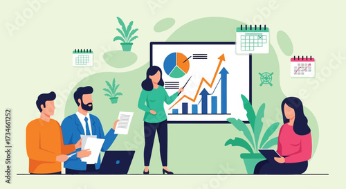 Happy parents looking at their daughter sitting on the floor with gift box and bags full of birthday presents, flat vector illustration. Happy family, birthday party celebration.