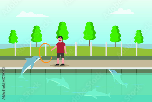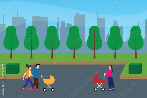 Volunteer team group of young people male and female characters sweeping and collecting garbage in city park, vector illustration. Park cleaning, volunteering concept for web banner, website page etc.
