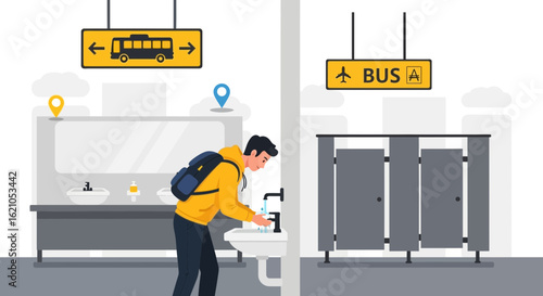 Passengers buying tickets at bus station, flat vector illustration. Intercity bus stop terminal with tourists.