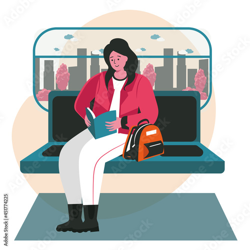 Passengers traveling by bus, flat vector illustration. Tourists, happy female characters sitting in comfortable seats inside coach. Public transport. Road travel.