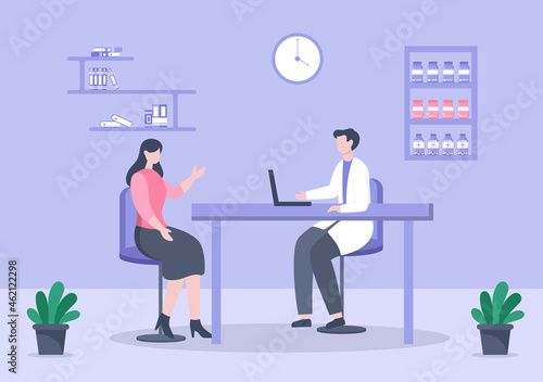Patient in face mask come to hospital to visit doctor. Woman sanitize her hands to protect from corona virus. Concept illustration. Vector web site design template. Landing page website illustration.