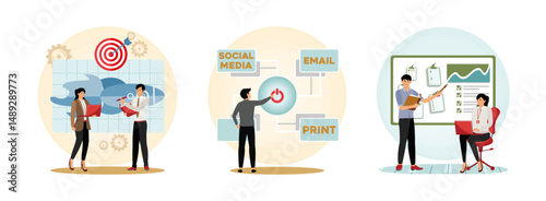 Patient visiting doctor scene set, flat vector illustration. Doctors appointment, consultation, treatment. Medical care for disabled people. Intravenous injection. Abdominal ultrasound scan. Pharmacy.