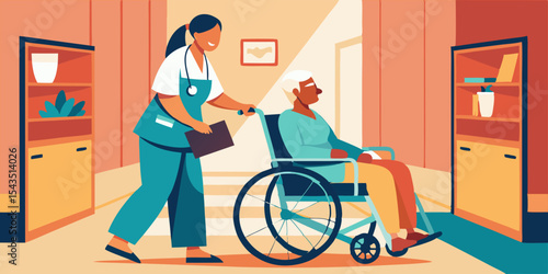 Woman with leg prosthesis sitting in wheelchair, flat vector illustration. Patient with disability visiting doctor to put on prosthetic limb. Disabled healthcare. Physical therapy. Orthopedic center.